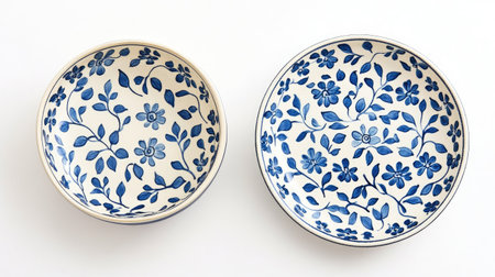 Two round bowls feature intricate blue floral designs on a white background. Perfect for home decor, table settings, or artistic displays, showcasing elegance.