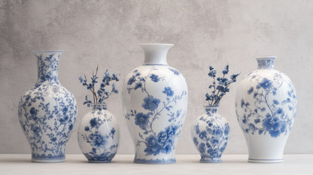 A stunning collection of blue and white vases featuring exquisite floral designs. Ideal for home decor or art spaces, showcasing timeless elegance and charm.