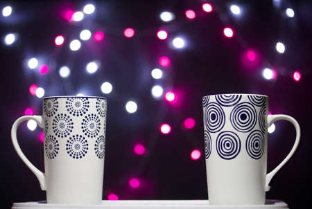 Two ceramic mugs. Against the background of pine boards and burning garlands. Festive atmosphere.