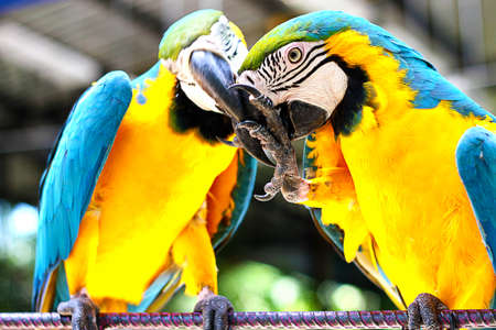 close up two parrot yellow and blue feather mating with love kiss