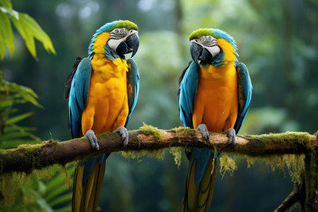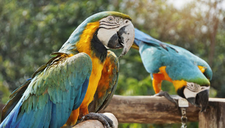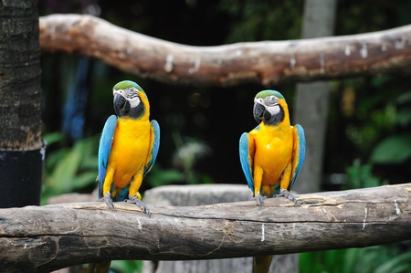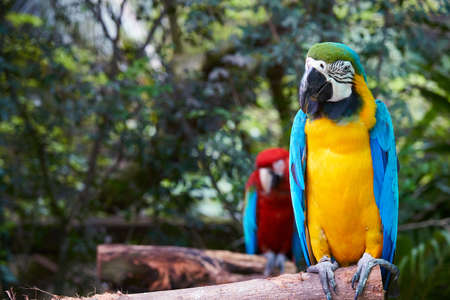A couple of colorful macaw parrot on tree branch.