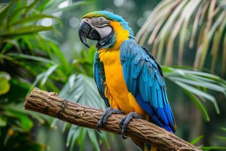 A striking macaw sits on a branch, surrounded by a vibrant tropical setting. Its colorful feathers beckon admiration, showcasing the beauty of wildlife in a natural habitat.