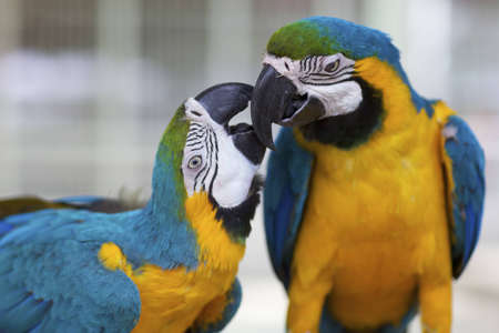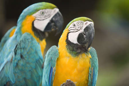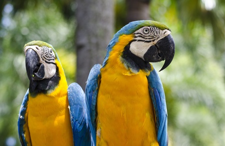 close up of two beautiful blue and yellow macaws (Ara ararauna)