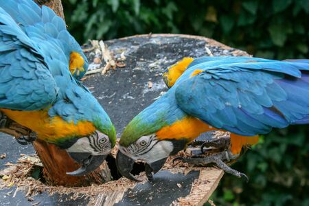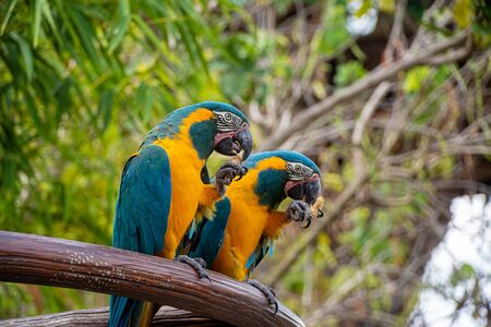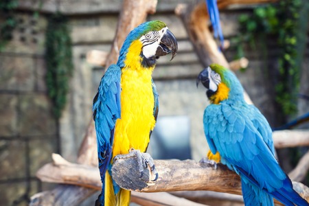 Two blue yellow parrots macaw on branch of old tree. Ara ararauna, Macaw parrot