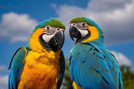 beautiful couple of macaw parrots on the blue sky background