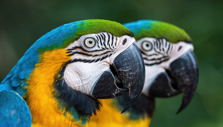 A close-up portrait of two vibrant blue and yellow macaws, showcasing their striking plumage and intelligent eyes against a blurred green background.
