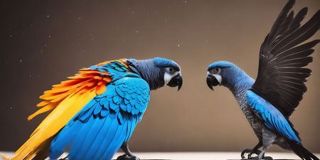 Beautiful blue and yellow macaw parrots on a brown background