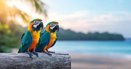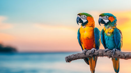 Bright macaws perched by the ocean at sunset in a tropical paradise. Generative AI