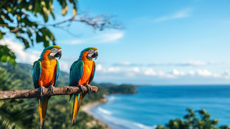 Tropical macaws perched on a branch overlooking the ocean in paradise. Generative AI
