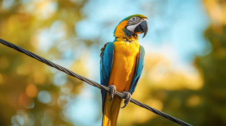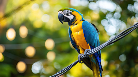 A Blue-and-yellow Macaw perched on a power line, a symbol of both its beauty and the challenges it faces in a changing world.