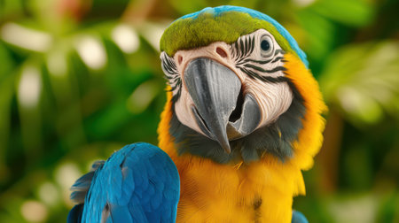 Blue and yellow macaw with vibrant feathers perched in a lush green environment