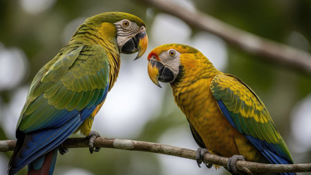 Two macaws are captured in a close-up, perched on a branch. The birds display vibrant yellow, green, and blue plumage. Soft sunlight illuminates the scene, highlighting their features. This image could be used for various commercial projects related to nature or wildlife.