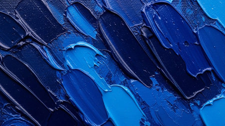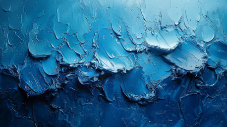 A close-up view of thick, textured impasto oil paint strokes applied to a canvas. The paint is layered and sculpted, creating a tactile surface with visible brush marks. The color palette consists of a range of blues, from deep navy and indigo to brighter cerulean and cobalt hues, creating a rich and vibrant abstract composition. The interplay of light and shadow across the textured surface adds depth and dimension to the