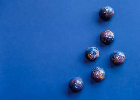 Colorful trendy blue molded chocolate pralines on dark background. Modern chocolate design.