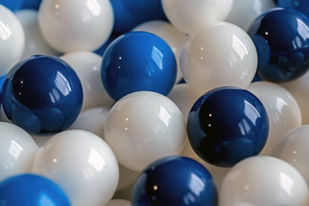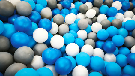 Colorful plastic balls in a play pool, featuring blue, white, and gray shades. Fun indoor playground detail, perfect for kids parties, recreation, and festive celebrations. Background