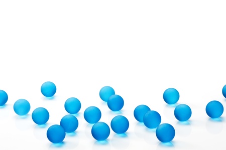 Many blue glass marbles on white background