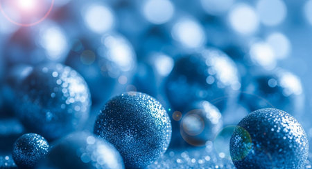 Closeup blue transparent balls sprinkled with sequins with selective focus. Abstract textured background with copy space.