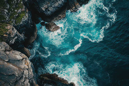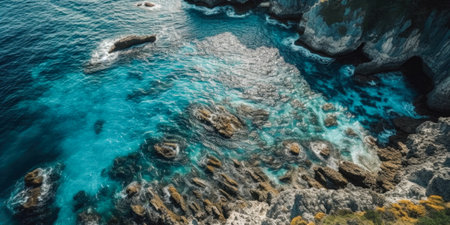 Aerial View of the Ocean and Rocky Coastline, Overhead capture of a rugged coastline caressed by a soothing sea, AI Generated