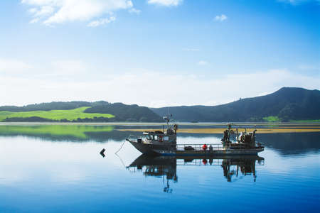Small fishing trawler moored in perfectly calm waters. Lush green of distant mountain on the other side of the bay. Quiet morning in Far North, New Zealand.