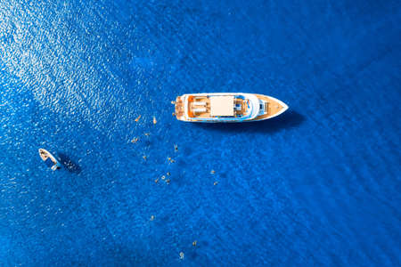 Aerial view of boats in Zakynthos island, Greece, Boats from air. Aerial view on sea in Turkey. Summer seascape with clear water in sunny day. Top view of boats from drone, AI Generated