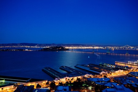 Docks with boats against a blue sky in San Francisco, CA, USA