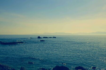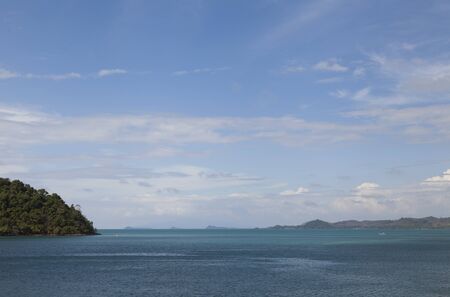 Tropical rippled and calm sea with small islands on the horizon and white fluffy clouds Sea surface space area.