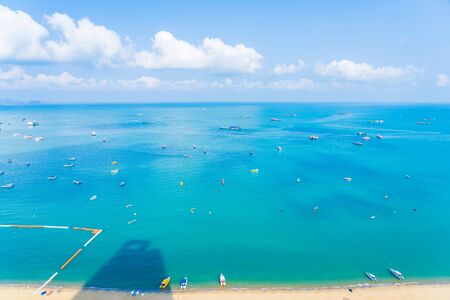 Beautiful tropical beach sea ocean bay around white cloud blue sky and architecture building in Pattaya city Thailand