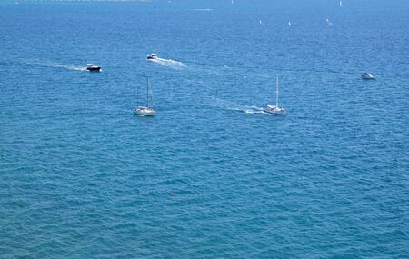 Overhead aerial drone view of yachts in mediterranean sea in summer sunny day near Nice, cote dazur, south France