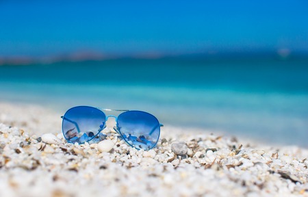 Close up of colorful blue sunglasses on tropical beach.