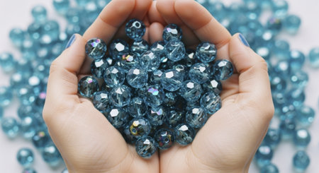 Woman hands gently cupping a large quantity of iridescent blue faceted glass beads, ideal for jewelry making and craft projects.