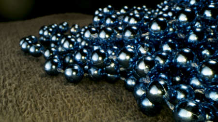 Close up of blue beads garland lying on the carpet. Stock footage. Decorative background with shining beads garland, concept of Christmas and New Year winter holidays.