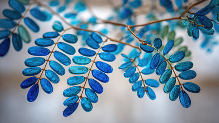 This image showcases a close-up of a branch with strikingly blue leaves, exhibiting a high level of detail and textural richness. The composition is set against a blurred background, accentuating the vivid color and intricate patterns of the foliage. Ideal for various commercial uses, including artistic designs, and decorative projects.