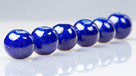 This image features a stunning blue beaded bracelet arranged neatly on a deep blue background. The glossy beads reflect light beautifully, capturing attention.