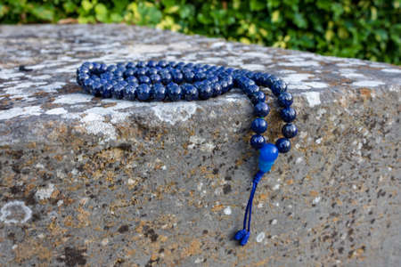 Close up of blue mala beads (lapis lazuli) on stone with green leaves in the background. Mindfulness and meditation accessory.