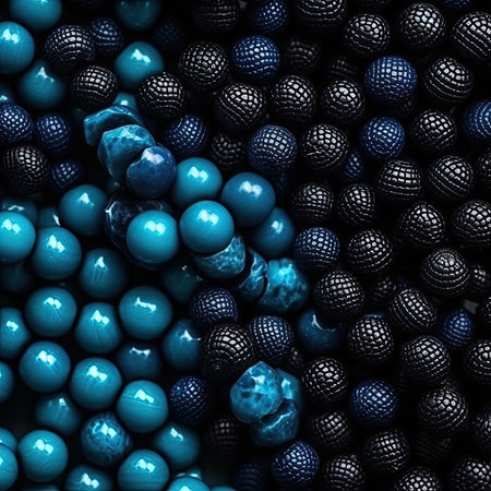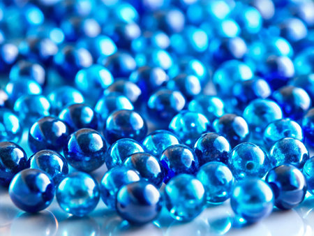 Shiny metallic beads are closely grouped together on a textured surface. A cool light casts a blue hue over the surface enhancing the textures.