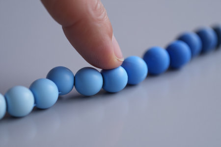 A man makes a bracelet out of blue beads. A close-up of a woman's hands stringing a bead to a bracelet with a thin thread. Hobbies and creativity. Art and earnings