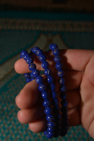 A serene close-up showing hands gently holding a string of prayer beads made from turquoise and wood, symbolizing spirituality and calmness.