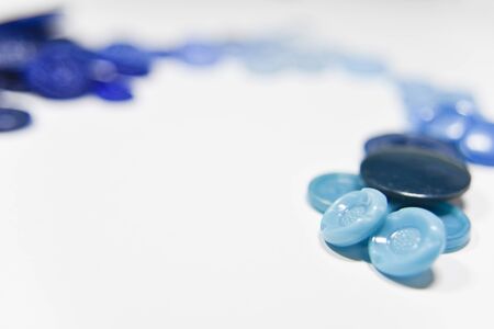 Blue buttons of different shape and size on the white background. Selective focus, handcraft concept. View from the side.