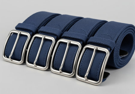 Four identical navy blue canvas webbing belts featuring large silver metal buckles, neatly aligned and stacked in a clean studio product photograph. durable accessory for fashion and utility.