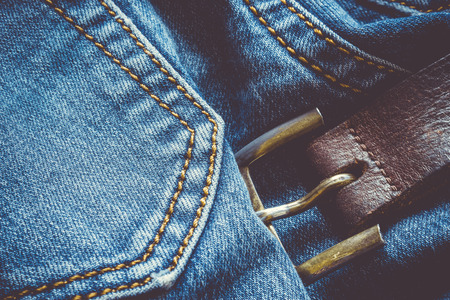 Close-up of a brown leather belt fastening on blue denim jeans in soft lighting