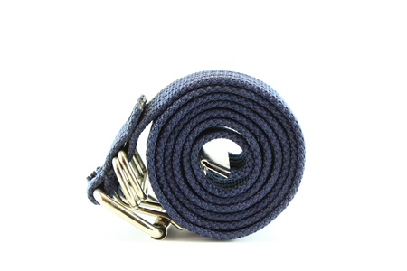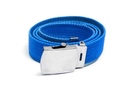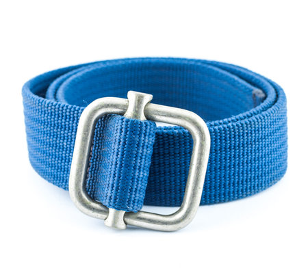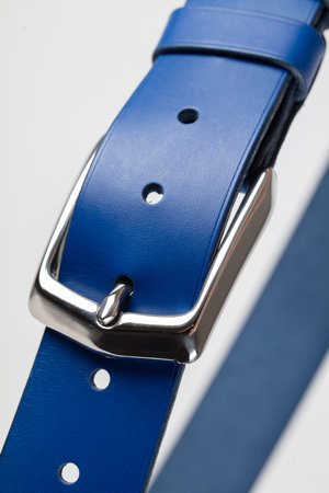 A close-up of a blue leather belt with a polished metal buckle isolated on a pure white background.