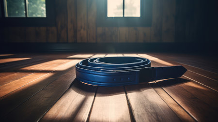 Black belt on a wooden table. Black and white photos. Selective focus.