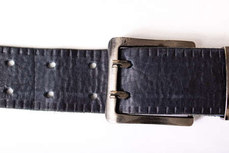 Blue jeans and black leather strap isolated on white background, men's casual clothing.