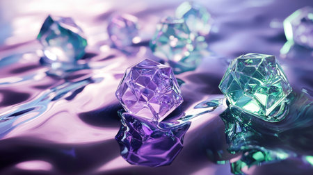 A captivating image of vibrant glass shards floating gracefully against a colorful background, enhanced by sparkling water droplets and soft focus elements.