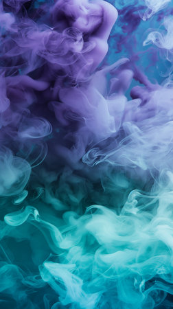 An abstract image showcases swirling smoke in shades of teal and purple against a dark backdrop. The composition features a textured, dynamic flow. The artwork uses color and form to create a visually interesting design. Suitable for use in a variety of visual projects and design applications.