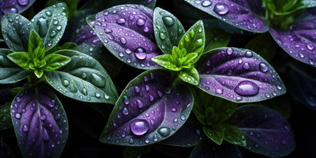 Beautiful basil close-up. Dew drops on leaves. Green and purple basil. Generative AI