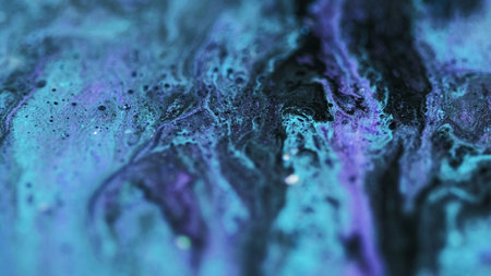 Glitter ink drip. Shiny paint mix. Blur blue purple black color shimmering sequin particles oil emulsion fluid spill abstract art background with bokeh lights.