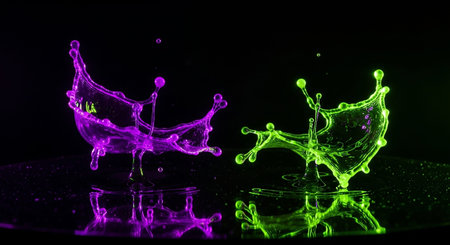 Two distinct liquid splashes, one vibrant purple and the other electric green, are captured mid-air against a stark black background. The splashes are intricately detailed, with delicate droplets and flowing curves, suggesting a moment of dynamic collision or formation. The glossy surface below reflects the colorful forms, doubling the visual impact and creating a sense of depth. The lighting accentuates the translucent nature of the liquids, highlighting their vibrant hues and the fluid...
