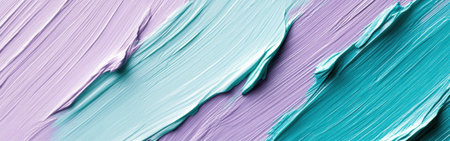 Dynamic abstract strokes flow harmoniously on the canvas, showing a blend of purple and teal tones. The artist's technique highlights the fluidity and texture of the colors.