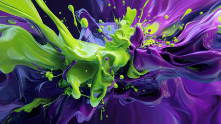 A striking 3D splash of bright green and vivid purple, with bold, dynamic forms spreading outward, creating a lively and abstract energetic background with vivid colors.